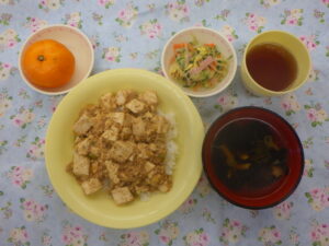 給食:チキンライス(鶏肉 人参 コーン マッシュルーム) 野菜スープ(キャベツ 人参 玉葱 ベーコン) ハムマリネ(ハム きゅうり サニーレタス 玉葱) フルーツ(バナナ)