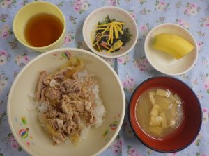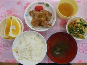 今日の給食 5月16日(金) 2025年5月16日 最終更新日時 : 2025年5月16日 nagafusanishi 給食:グリンピースごはん(白米 グリンピース) すまし汁(とろろ昆布 長ねぎ) ミルフィーユカツ(豚ロース) 付合せ(キャベツ) 白和え(絞り豆腐 アスパラ 人参 糸こんにゃく) フルーツ(ジューシー) おやつ:プリンアラモード