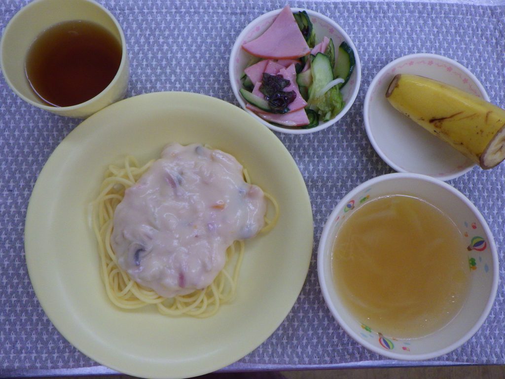 給食:クリームスパゲティー(スパゲティー ベーコン 人参 玉葱 マッシュルーム 牛乳 生クリーム) オニオンスープ(玉葱 コンソメ) ハムマリネ(ハム 玉葱 サニーレタス きゅうり) フルーツ(バナナ)