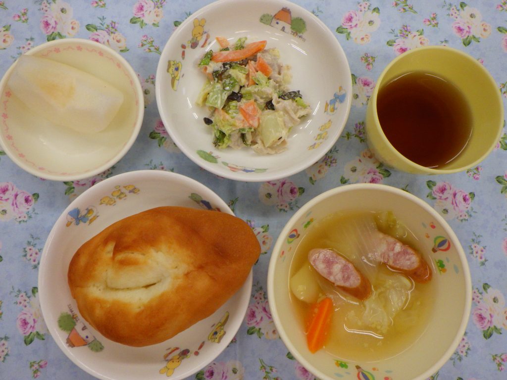 今日の給食 10月14日(火) 2025年10月14日 最終更新日時 : 2025年10月14日 nagafusanishi 給食:ソフトフランス ポトフ(人参 玉葱 キャベツ ウインナー じゃが芋 コンソメ) 茹で豚の味噌マヨ和え(豚肉 人参 サニーレタス しめじ キャベツ マヨネーズ 味噌 すりごま) フルーツ(梨) おやつ:牛乳 アメリカンドッグ