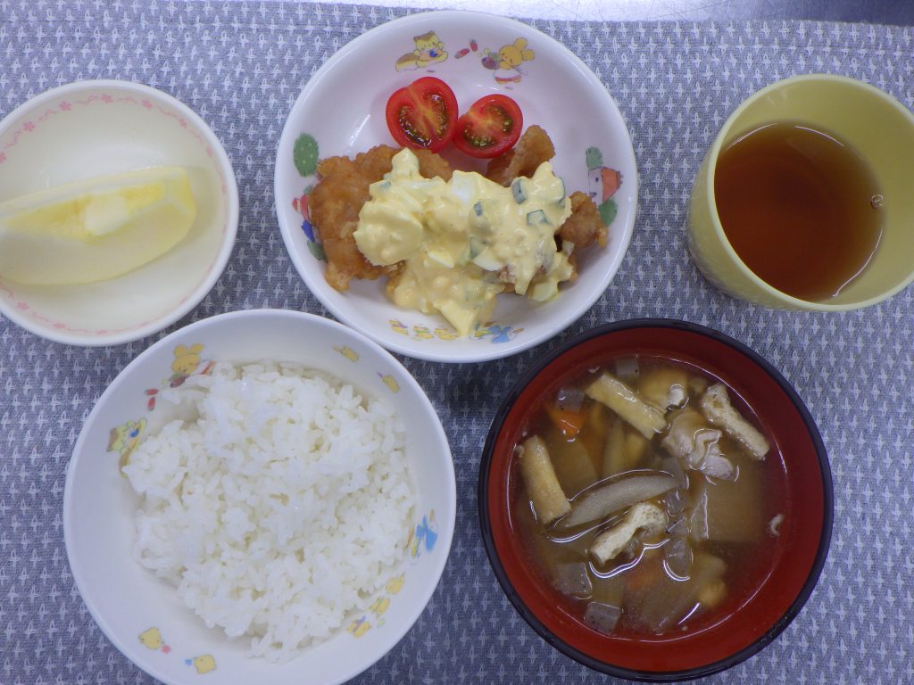 今日の給食 10月31日(金) 2025年10月31日 最終更新日時 : 2025年10月31日 nagafusanishi 給食:ごはん けんちん汁(豚肉 大根 人参 里芋 ごぼう 油揚げ こんにゃく 豆腐) チキン南蛮(鶏モモ 玉葱 きゃうり 卵 マヨネーズ) 付合せ(ミニトマト) フルーツ(りんご) おやつ:フルーツゼリー