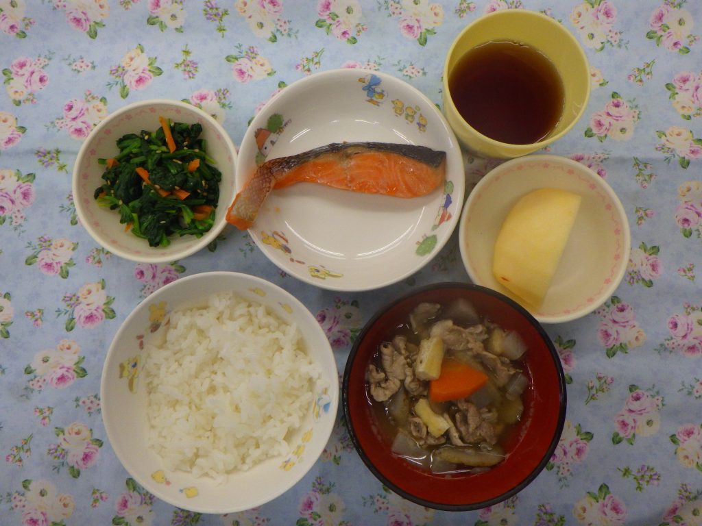 今日の給食 11月10日(月) 2025年11月10日 最終更新日時 : 2025年11月10日 nagafusanishi 給食:ごはん 豚汁(豚肉 油揚げ 人参 大根 こんにゃく ごぼう) 鮭の塩焼き(しろさけ) おひたし(ほうれん草 人参 ごま) フルーツ(りんご) おやつ:ヨーグルト ビスケット