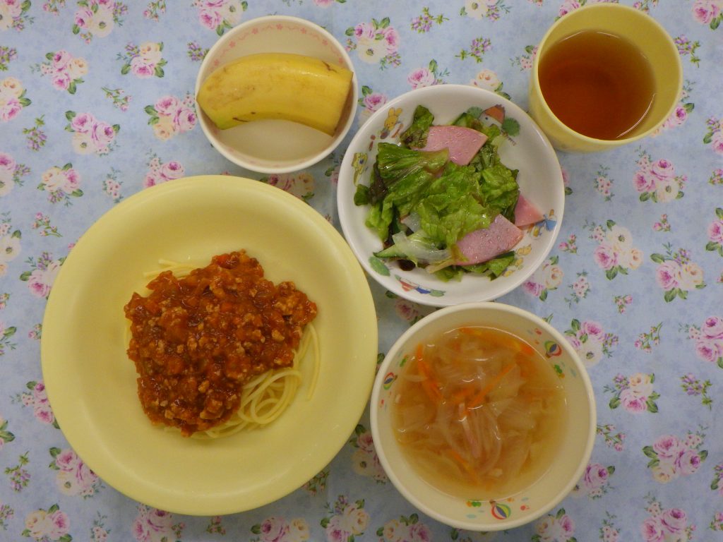 給食:ミートソーススパゲティー(スパゲティ ミートソース ぶた挽肉 玉ねぎ にんじん ピーマン) 野菜スープ(キャベツ 玉ねぎ にんじん ベーコン) ハムマリネ(ハム 玉ねぎ サニーレタス きゅうり) フルーツ(バナナ)