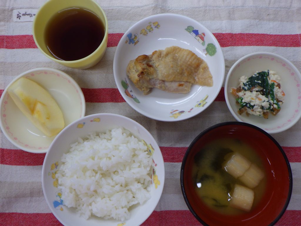 今日の給食 11月12日(水) 2025年11月13日 最終更新日時 : 2025年11月13日 nagafusanishi 給食:ごはん みそ汁(小町麩 わかめ) 鶏肉も西京焼き(鶏モモ 味噌 みりん) 白和え(絞り豆腐 ほうれん草 人参 糸こんにゃく) フルーツ(りんご) おやつ:牛乳 チーズワンタン