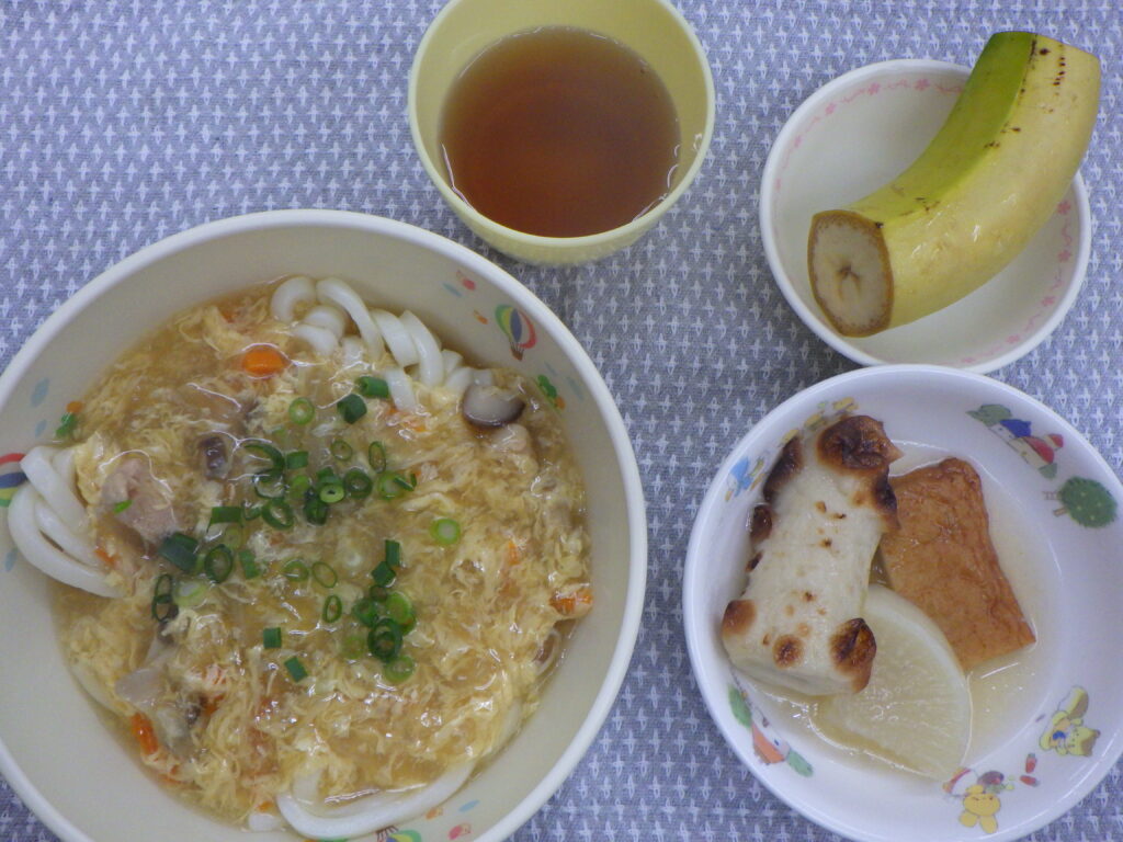 今日の給食 1月23日(金) 2026年1月23日 最終更新日時 : 2026年1月23日 nagafusanishi 給食:玉子とじうどん(うどん 鶏モモ 人参 玉葱 しいたけ 卵 小葱) おでん(大根 ちくわ さつま揚げ) フルーツ(バナナ) おやつ:麦茶 いなり寿司
