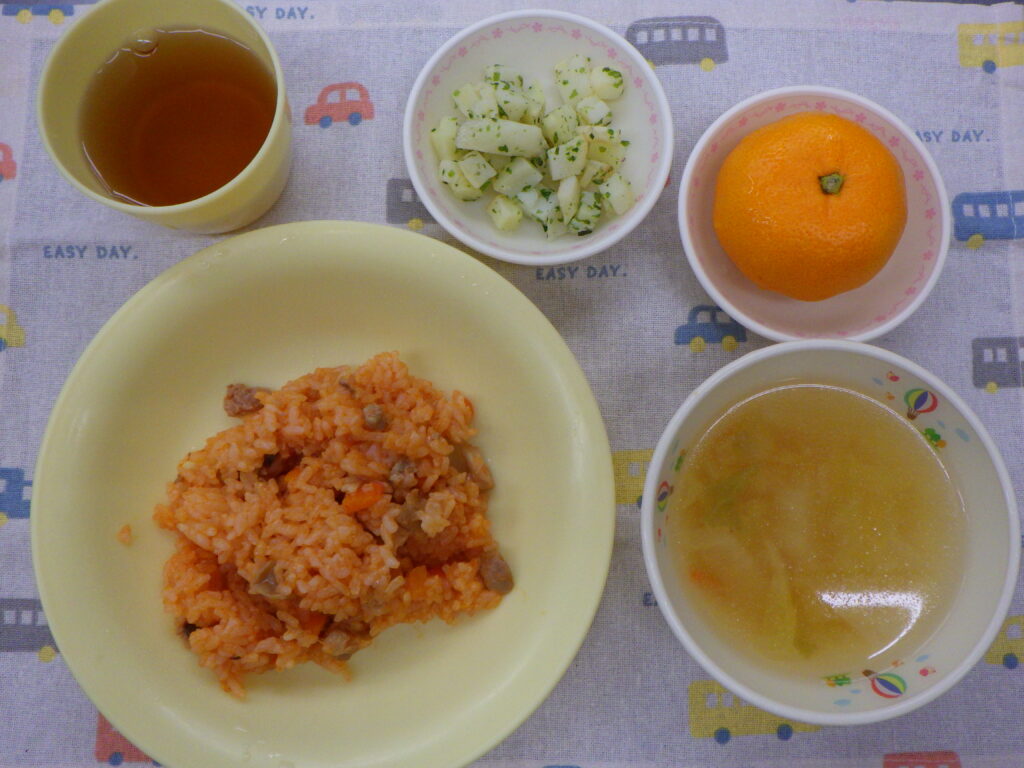 今日の給食 2月10日(火) 2026年2月10日 最終更新日時 : 2026年2月10日 nagafusanishi 給食:チキンライス(白米 鶏肉 人参 マッシュルーム トマトケチャップ) 白菜スープ(白菜 人参 ベーコン コンソメ) じゃが芋の青のり和え(じゃが芋 青のり) フルーツ(みかん) おやつ:牛乳 ハムチーズ春巻き