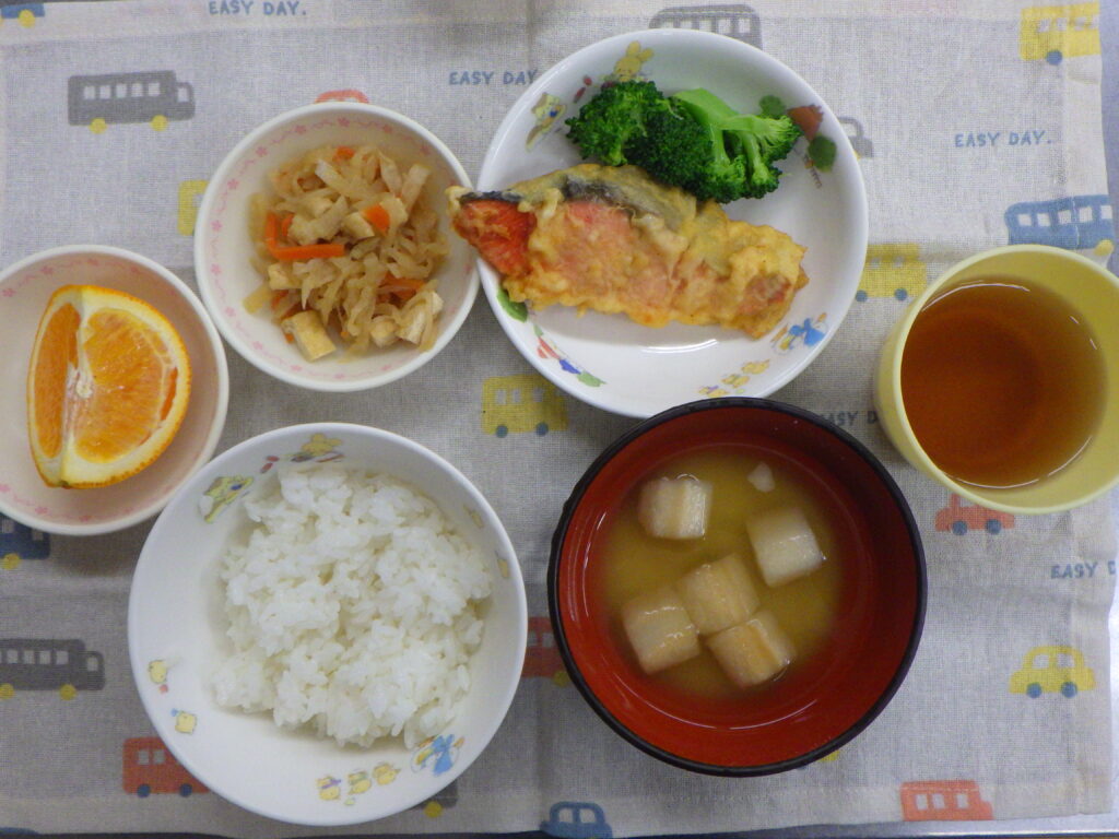 今日の給食 3月19日(木) 2026年3月19日 最終更新日時 : 2026年3月19日 nagafusanishi 給食:ごはん みそ汁(小町麩 わかめ) 鮭のあけぼの揚げ(鮭 人参) 付合せ(ブロッコリー) 切り干し大根(切り干し大根 人参 油揚げ) フルーツ(清見オレンジ) おやつ:牛乳 ラスク